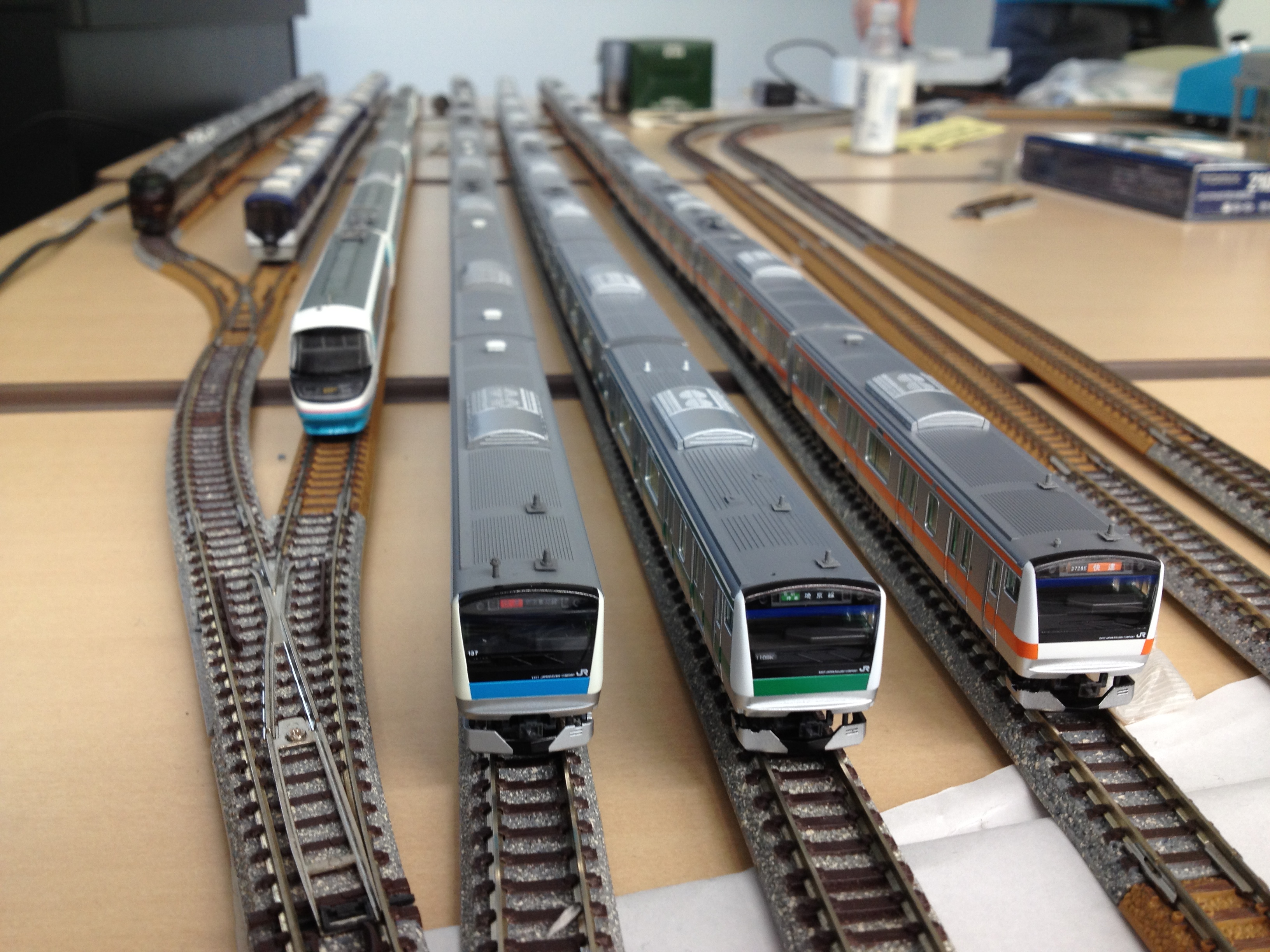 ▲準備期間に3色そろったE233系は、当日になり4色に増加。同形式・同路線同士のバリエーションも多種多様なプラレールレイアウトとなりました。