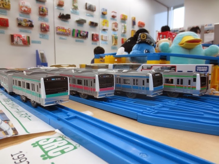 ▲大きな変更として留置線を手前に移動させました。祭期中はプラレールとともに「E233系3並び」をはじめ、いろいろな車両が停泊していました。