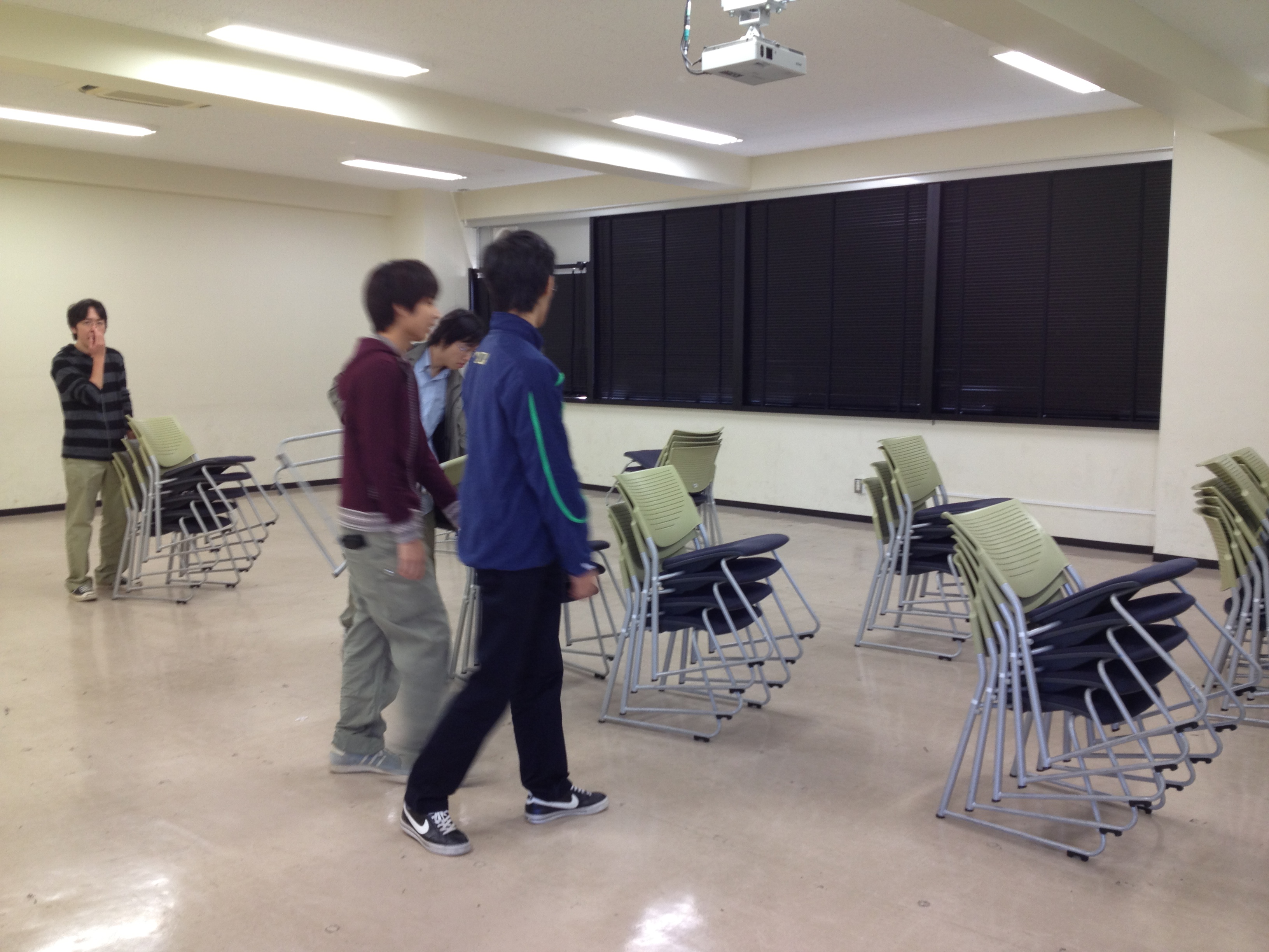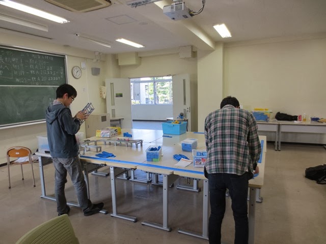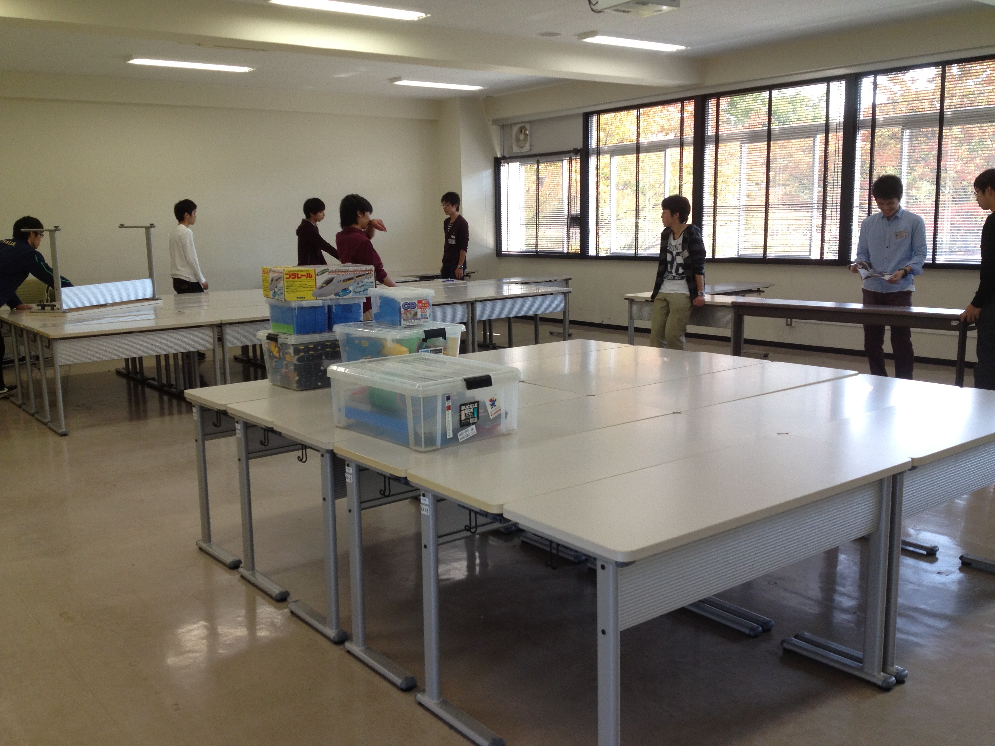 机の運びだしが終わる頃にはもうお昼。だんだん展示会場っぽくなってきました。学祭準備の醍醐味の1つです。記事冒頭の写真と角度が同じなため、比較してみるとわかりっやすいと思います。