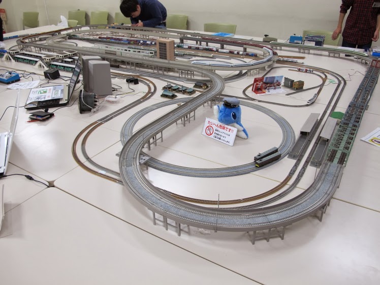 お昼過ぎから設営を開始し、16時前、模型レイアウトの方はようやく車両が走行!EH500形機関車が本線を試走します。模型レイアウトは設営は順調でしたが走行トラブルが頻発。結局夜までメンテナンスを続けることとなりました。。。