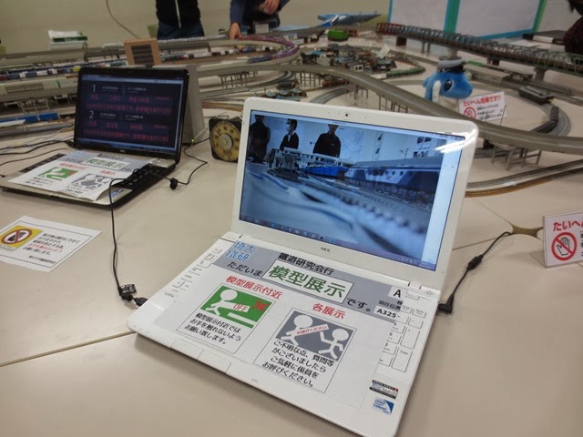 今年はレイアウトにWebカメラを配置し、よりリアルな目線での映像をお楽しみいただけるようにしました。奥のパソコンは運転体験のご案内で、ボタンを押すと約100種類の全国各地の発車メロディが流れます。パソコンとパソコンの間には鉄道模型の速度と同期して動くリアル速度計を今年も配置!