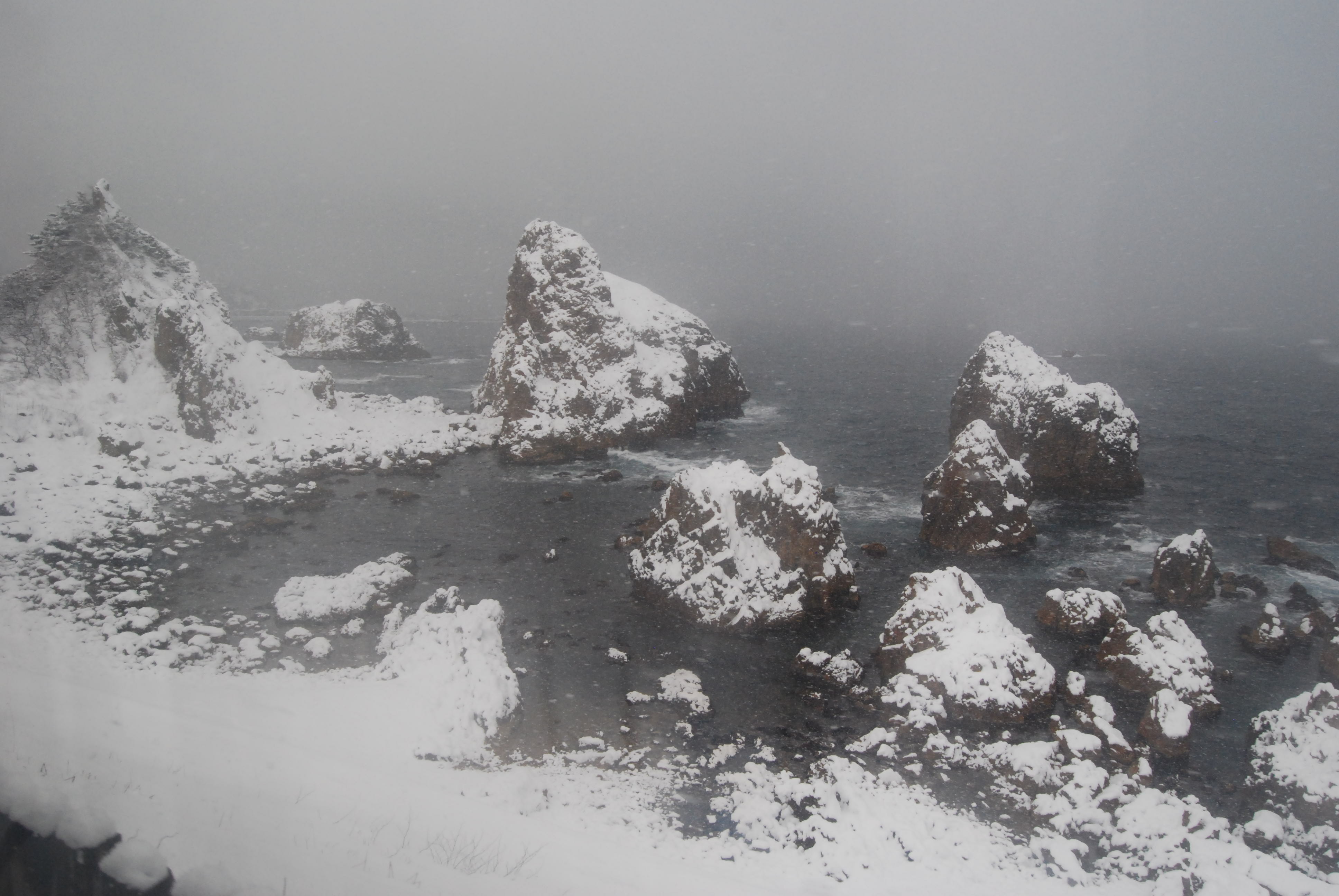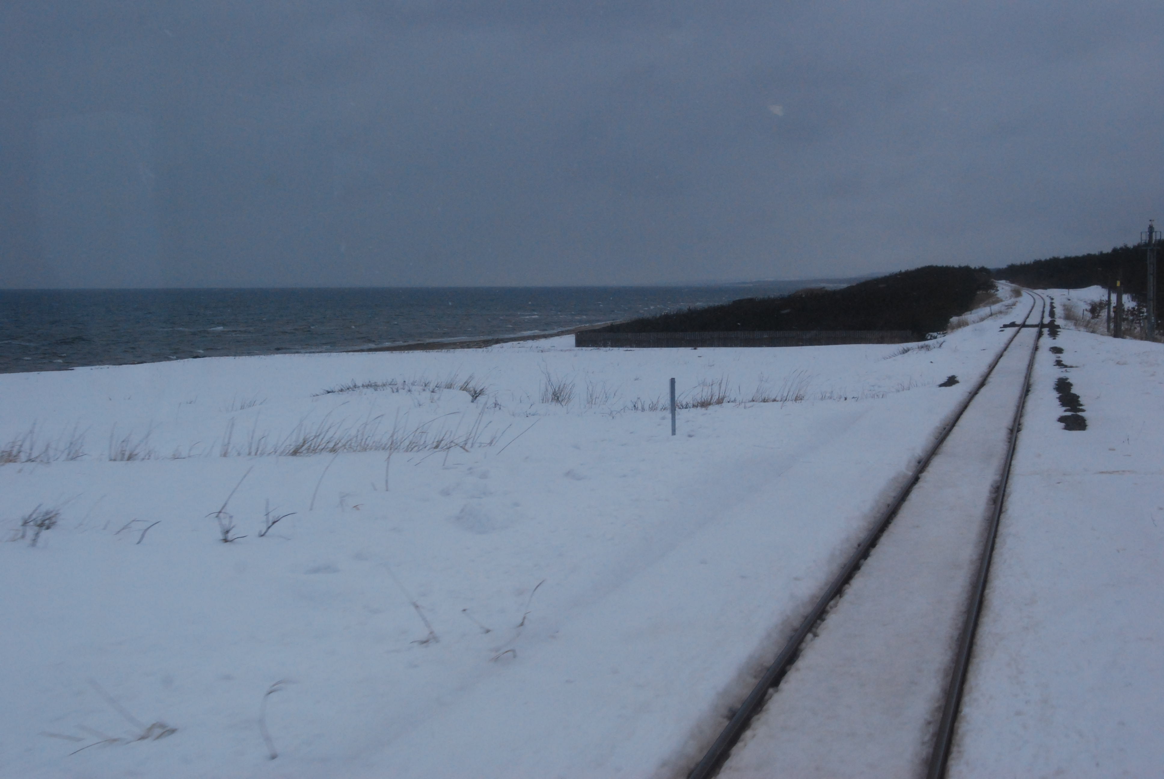 列車は五能線内に入り、冬の日本海側を進んでいきます。その景色がこちら。ちょっと曇ってしまいましたが、冬の日本海のすばらしい景色を堪能できました!夏と冬では同じ路線でも違った風情を見せてくれるのは面白いところです。