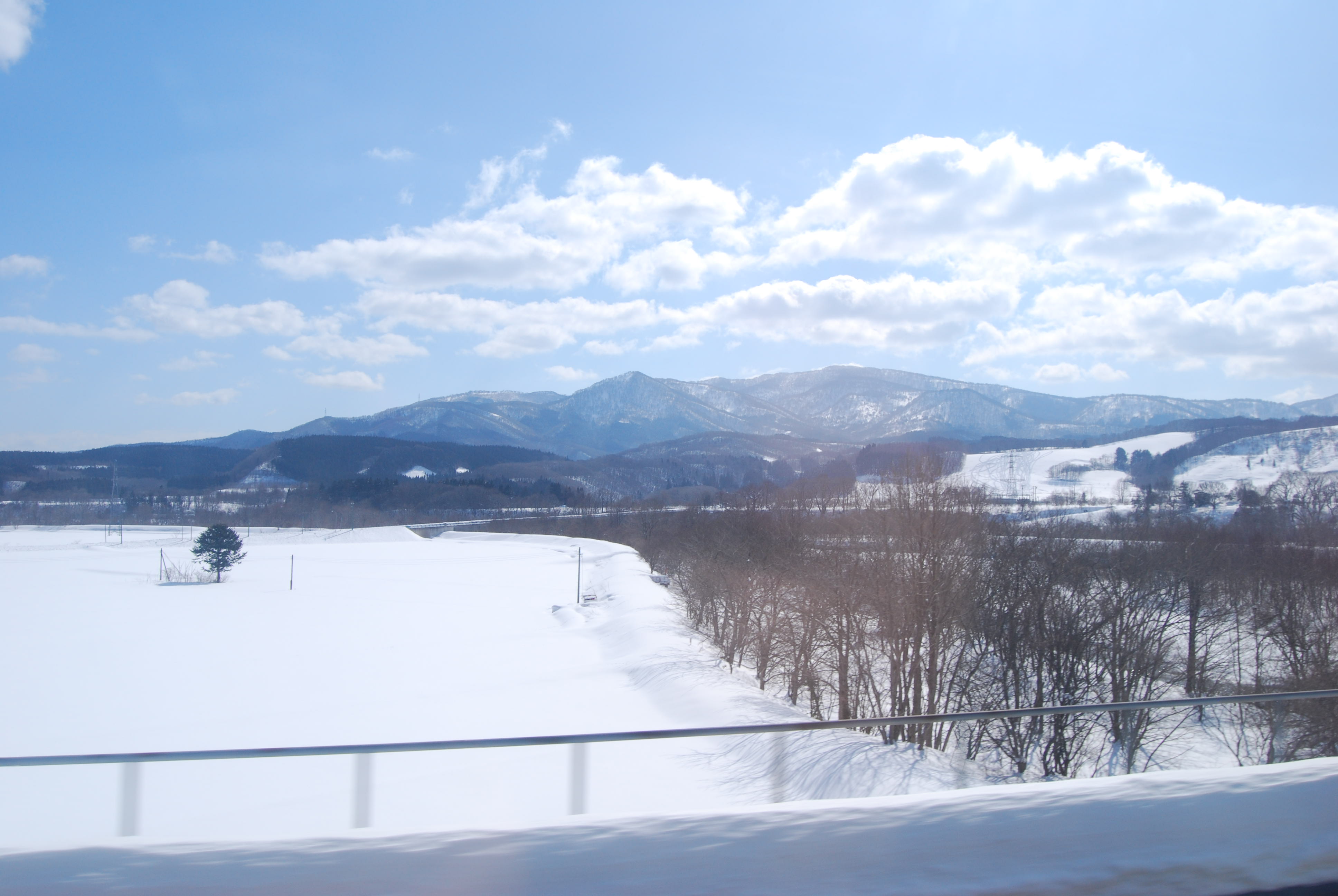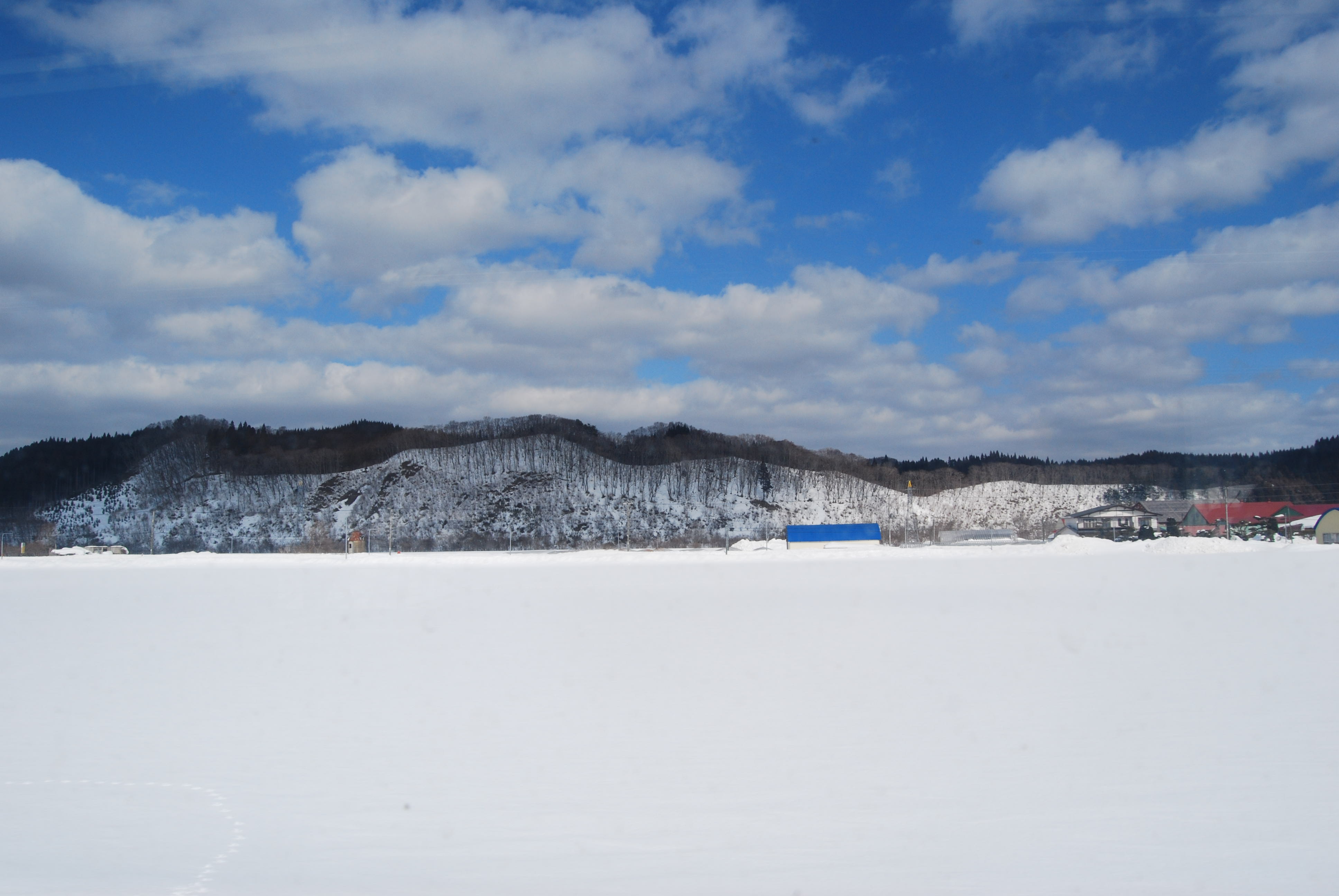 ▲青函トンネルを抜け、北海道へ上陸した付近の車窓。(知内駅周辺)北の大地へのワクワク感が沸いてきます。