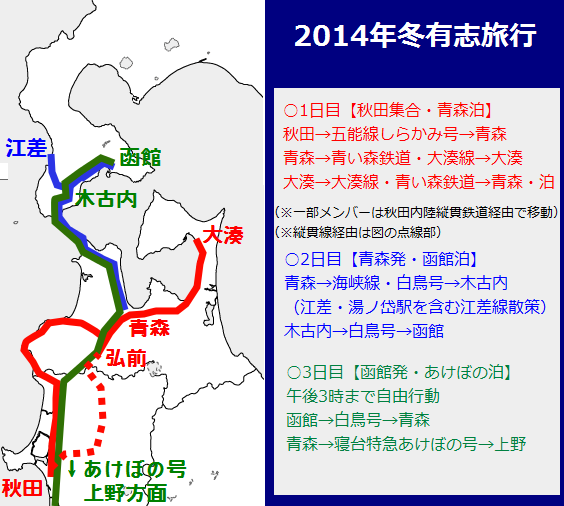 今回の旅行は、夏旅行で惜しくも台風による雨のため断念した江差駅への到達(つまりリベンジ)と3月をもって廃止となる寝台特急「あけぼの」の乗り収めの2つが大きなテーマとなりました。旅程は上の画像通りとなりますが、改めてまとめると以下の通りです。