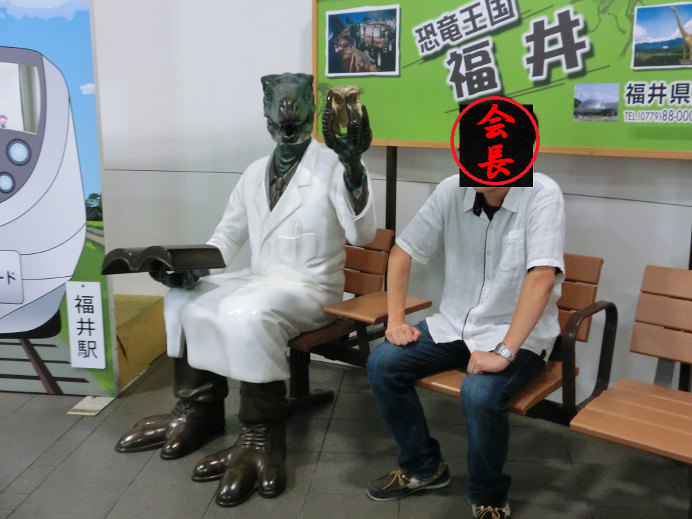 ▲福井駅の有名?撮影スポットにて 当会の会長が体を張ってモデルを務めました。(※個人情報保護のために画像に加工を施してあります)