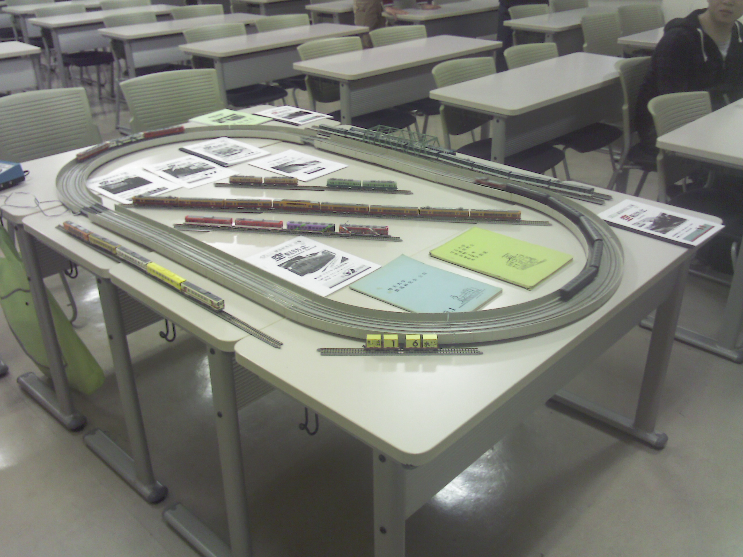 ▲10日の説明会の模型レイアウトは大きすぎた…ということで16日の説明会では少し小さ目に。今回の新歓では展示から進行などの細かい部分まで会員内の話し合いで詰めて決めていきました。教室の確保からここまで、長い道のりでした(笑)