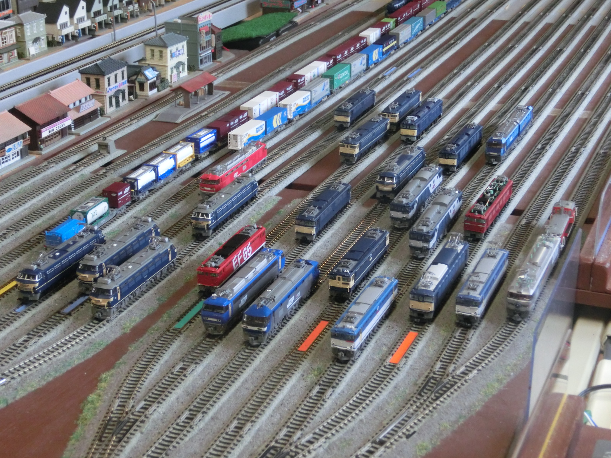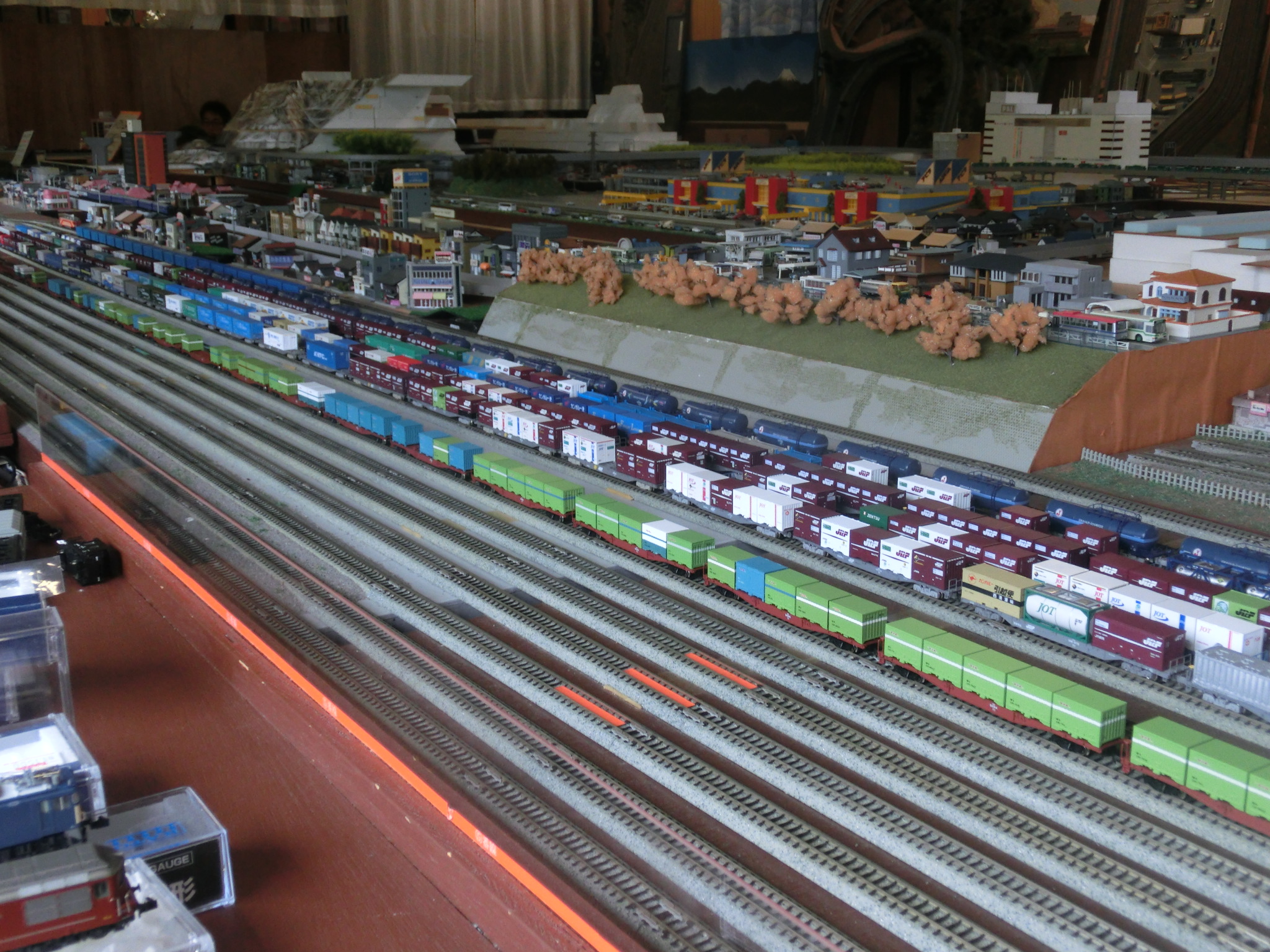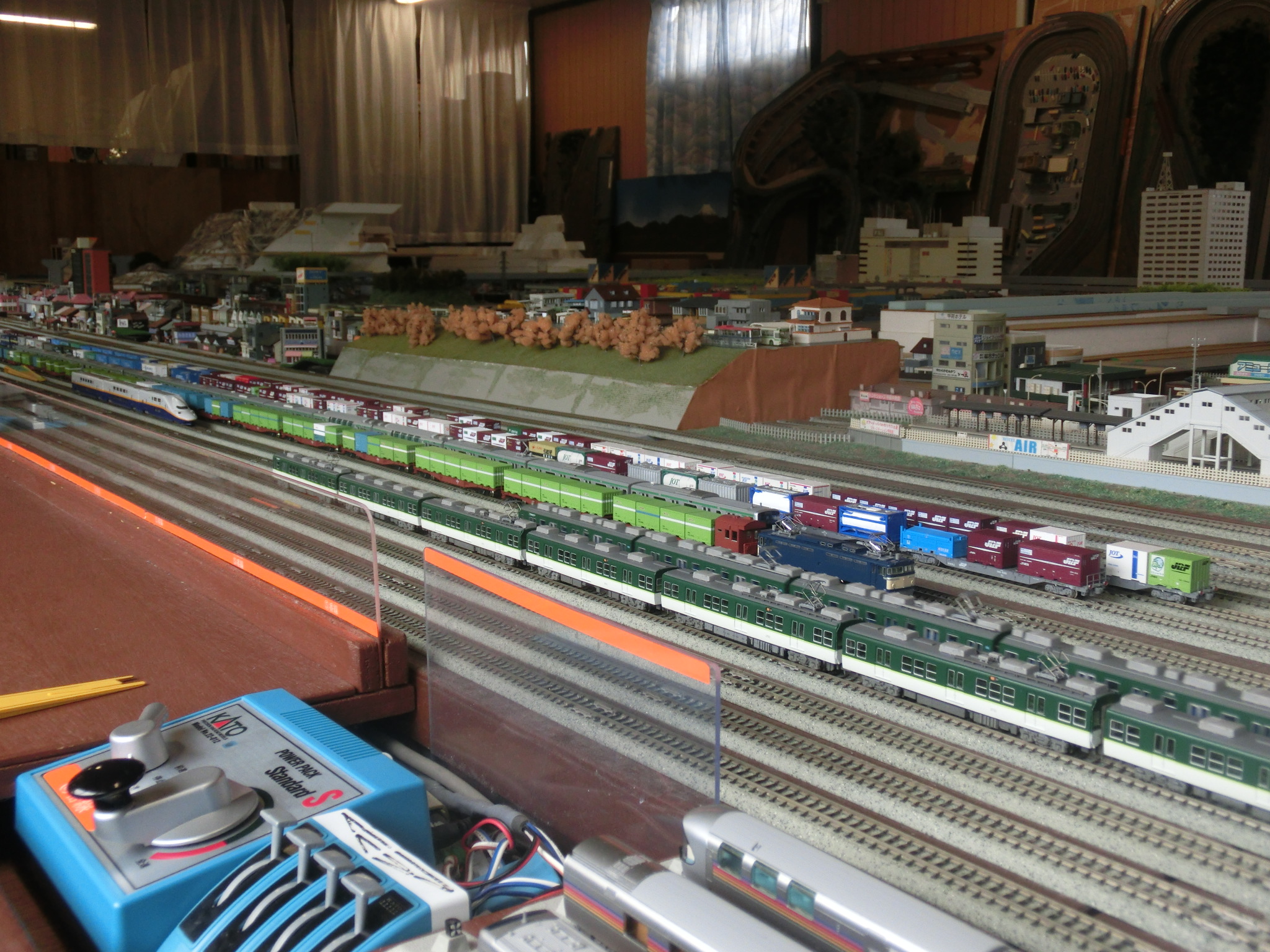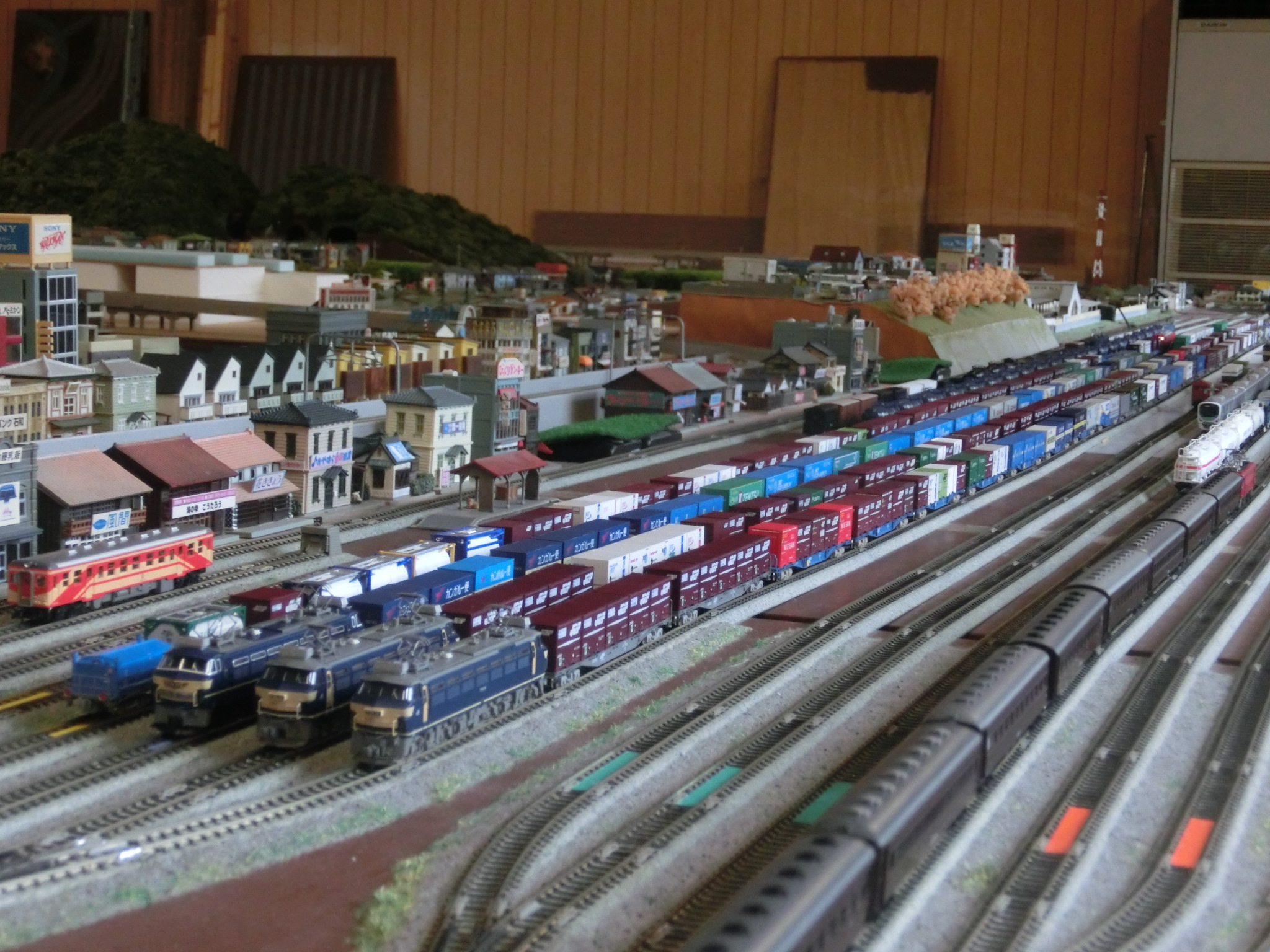 この広いレイアウトで参加した会員は思い思いの車両を持ち込んで走らせました。驚くべきはそのヤードの長さで、長い貨物列車が並んでもまだまだ余裕のある長さです。