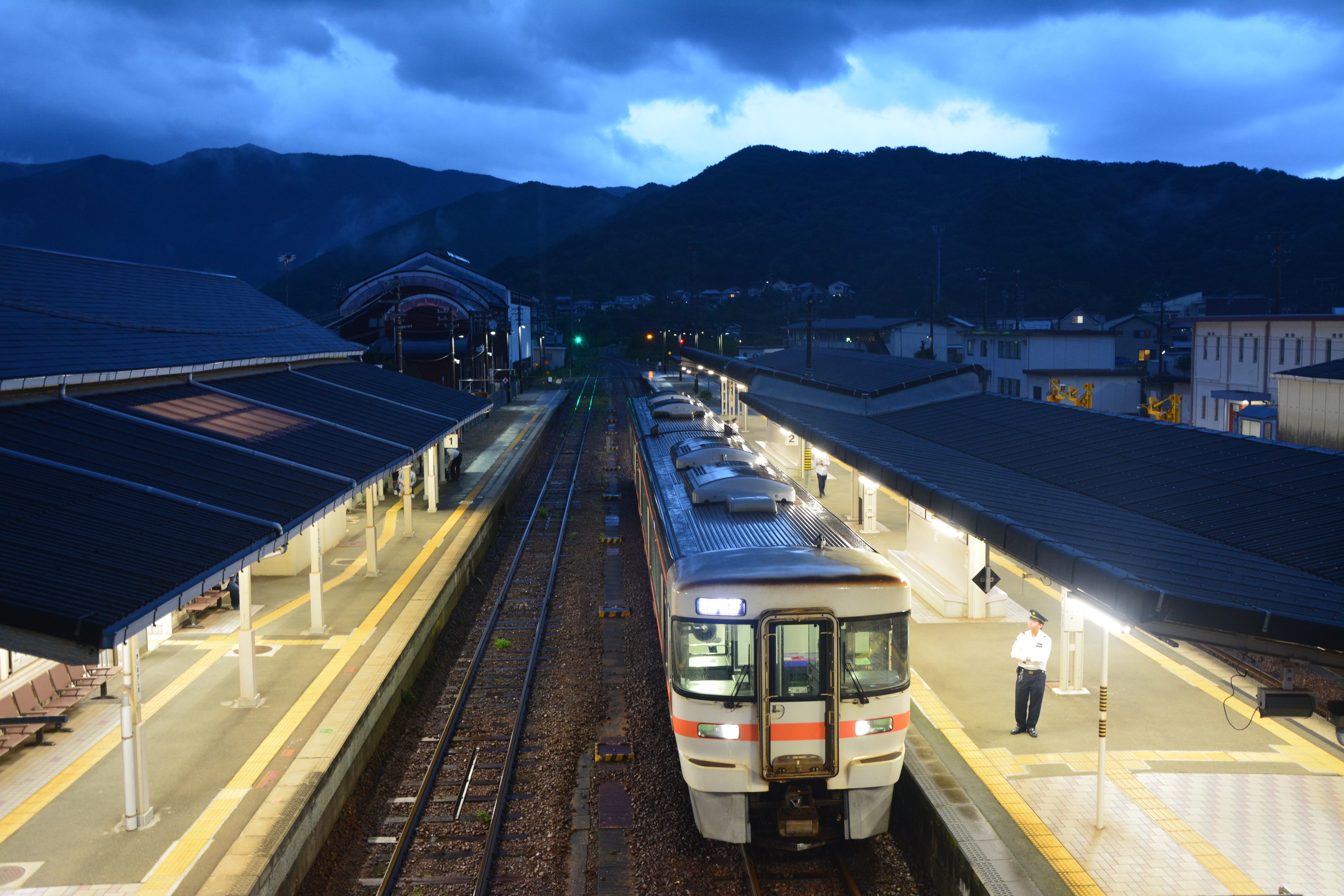 熊野市駅までは他に乗客もおらず、それぞれおしゃべりしたりかぶりついたり、長時間停車では乗務員さんと交流したりしつつ、20時過ぎに新宮駅に到着。