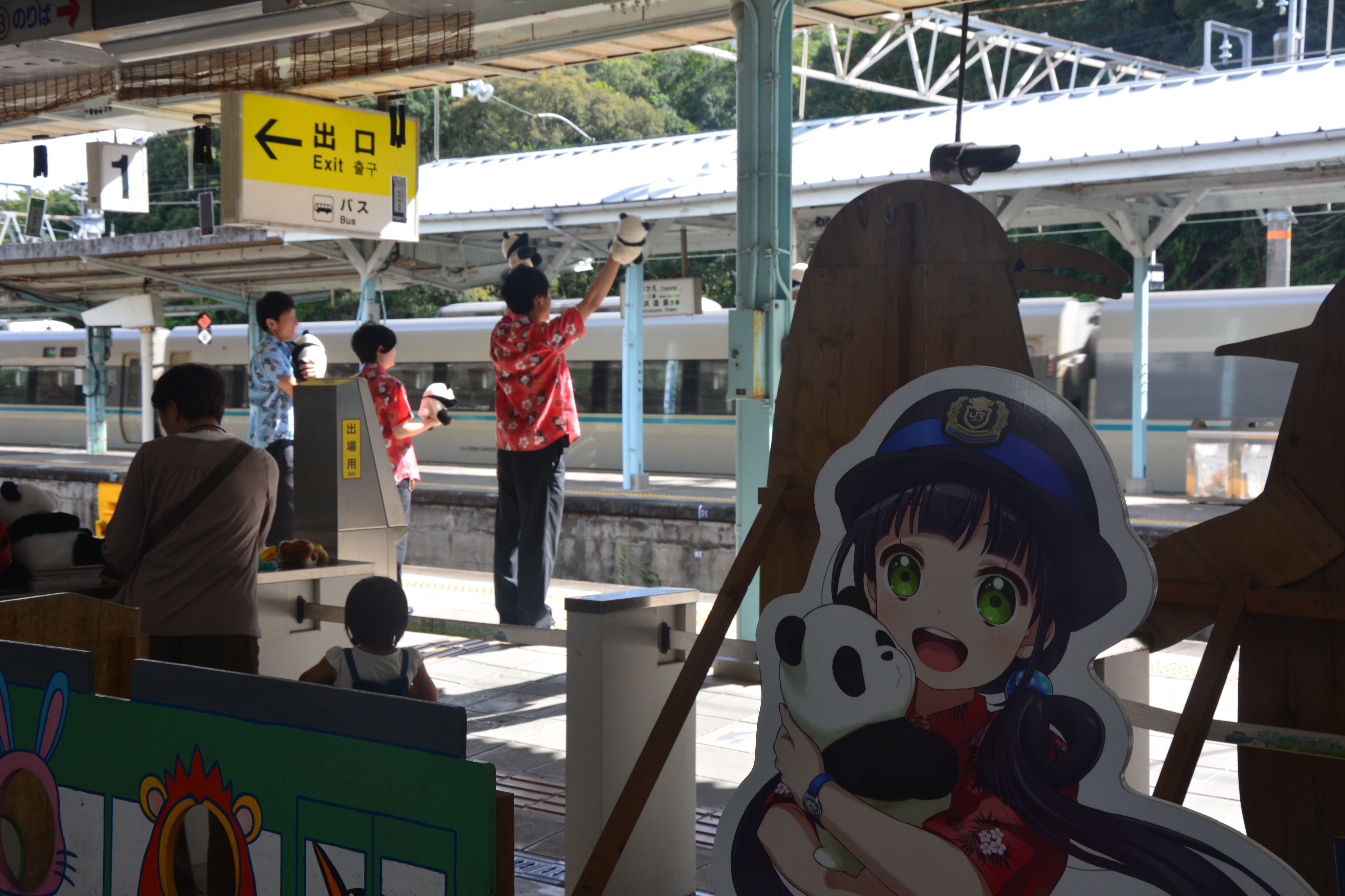 ▲くろしお14号を見送る駅員さんと、鉄道むすめ『黒潮しらら』(白浜駅撮影)