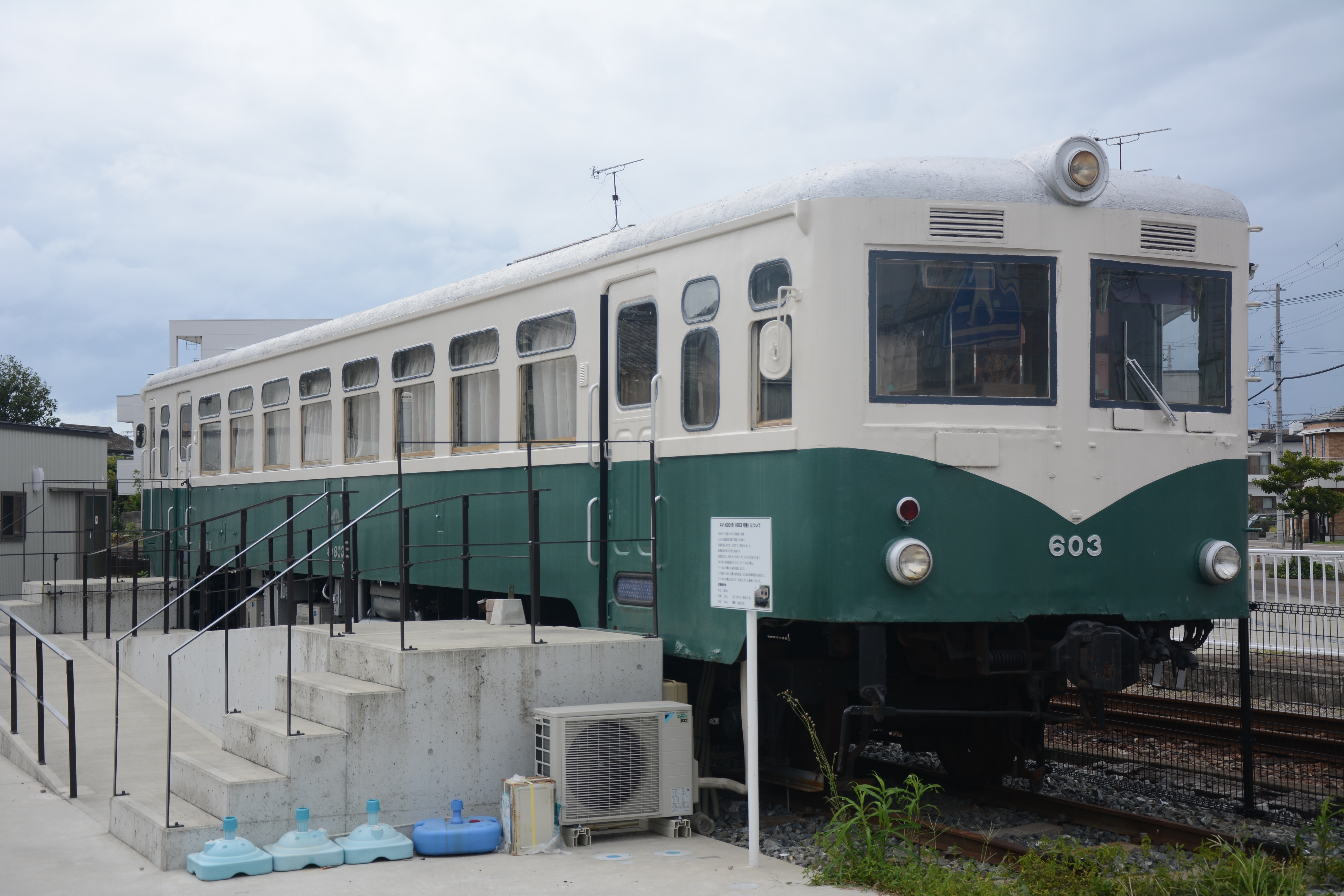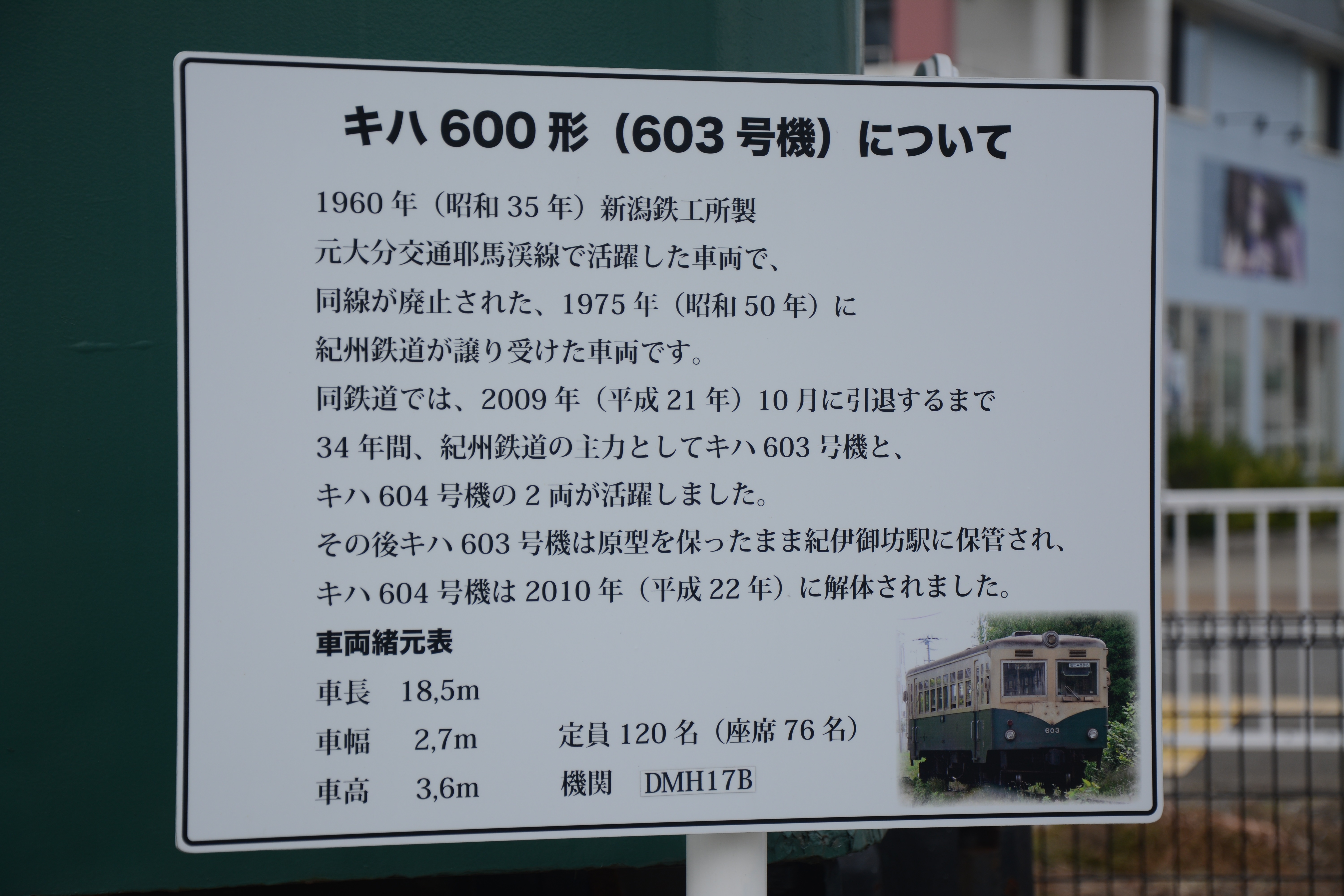 ▲紀伊御坊駅付近の広場に保管されているキハ603号。大分交通から譲渡され、2009年に引退。(ほんまち広場撮影)