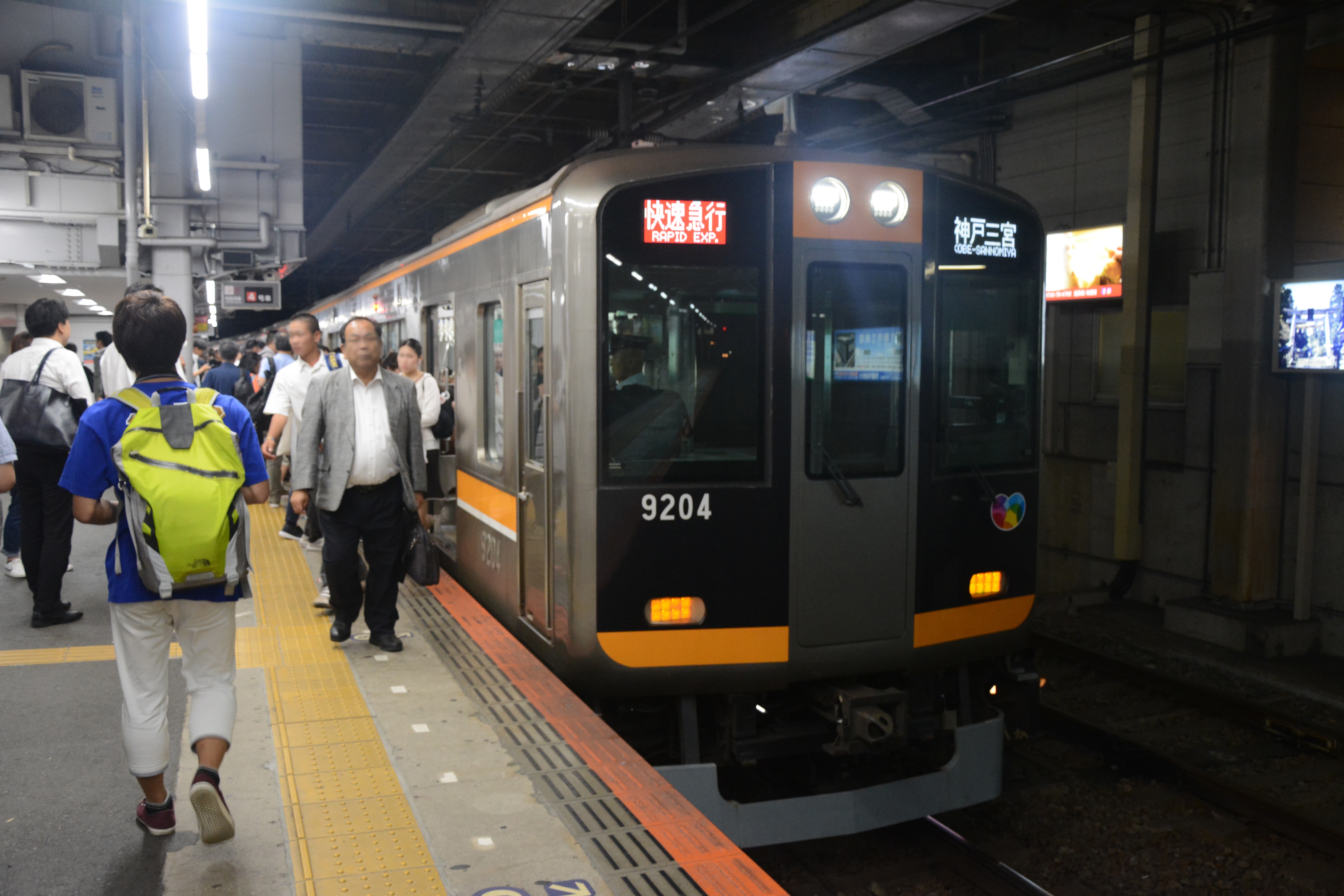 到着したのは阪神電鉄9000系の快速急行。混雑しておりかつ阪神電車なのに副会長は横浜DeNAのシャツを着て乗りこみ、命の危険を感じま…せんでした。