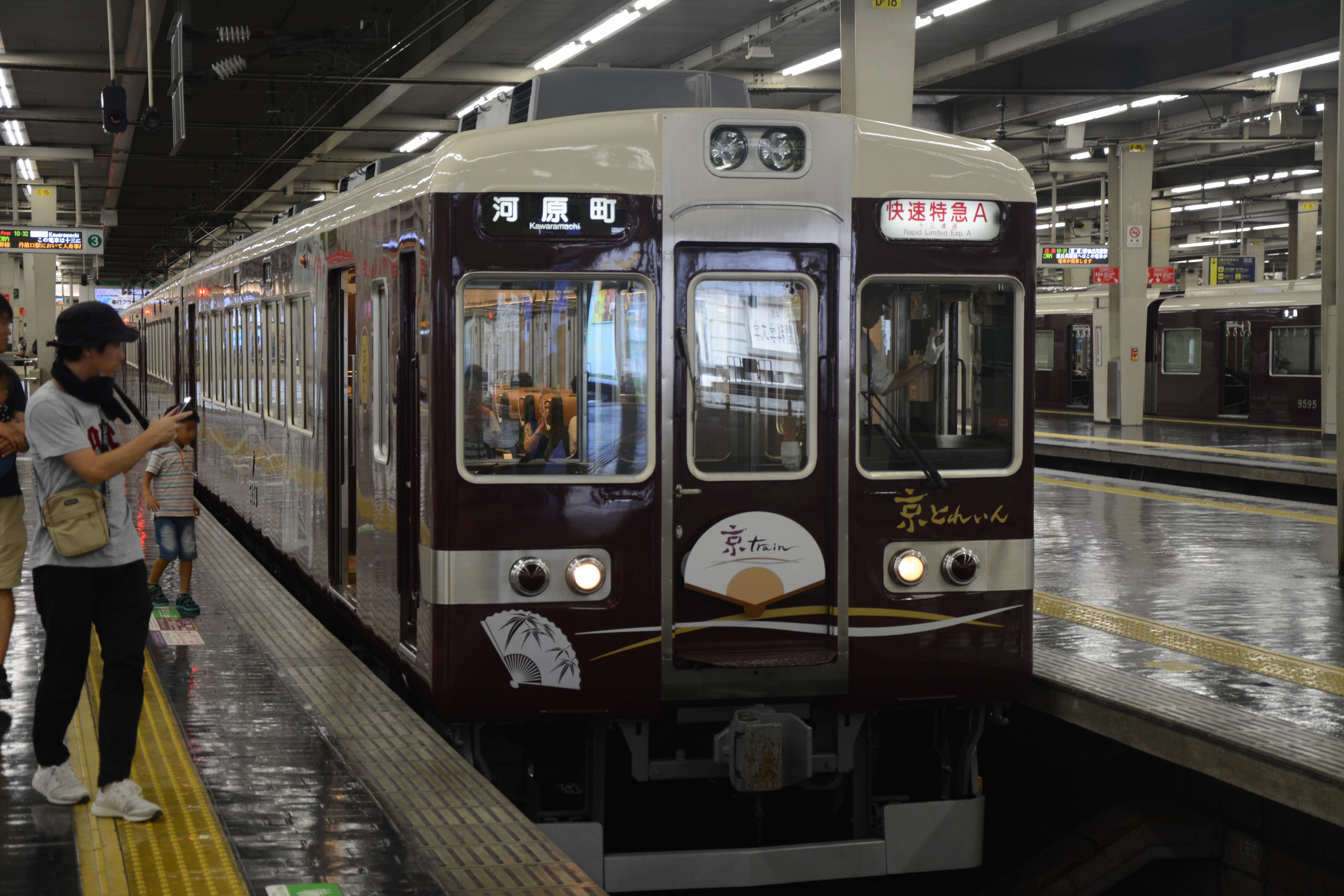 到着すると、ちょうど阪急6300系『京とれいん』が入線。そう、我々はこの列車で京都方面へ向かうのです。