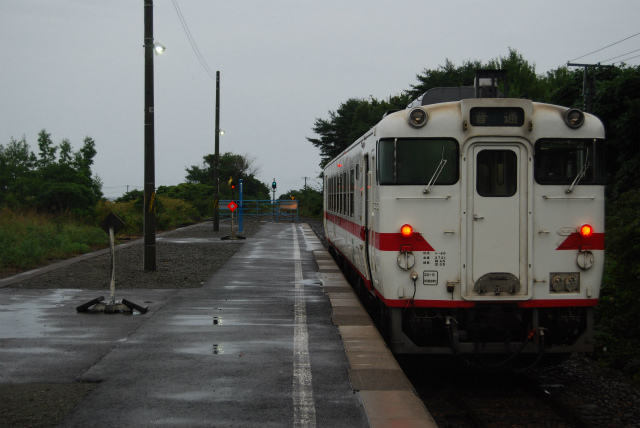 ↑雨の三厩駅にたたずむ津軽線の列車。ローカル線に来た感じがします。
