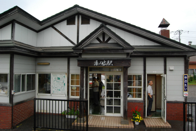 ↑廃止になる湯ノ岱駅の駅舎と運転中止となった函館駅からの江差行列車。