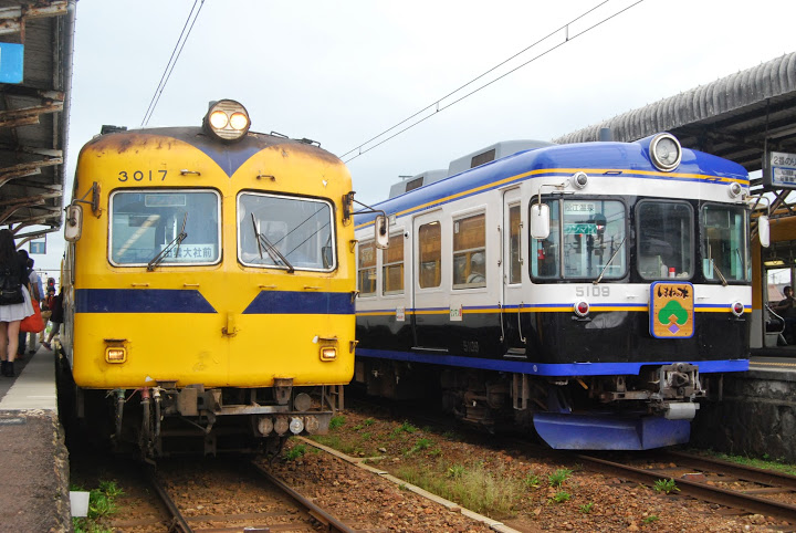 ▲途中の川跡(かわと)駅で右の電車(松江しんじ湖温泉行)から左の電車(出雲大社行き)にお乗換え。かつて右の電車は京王で左の電車は南海で走っていました。一畑電車では古い電車の活躍もまだ見られます。