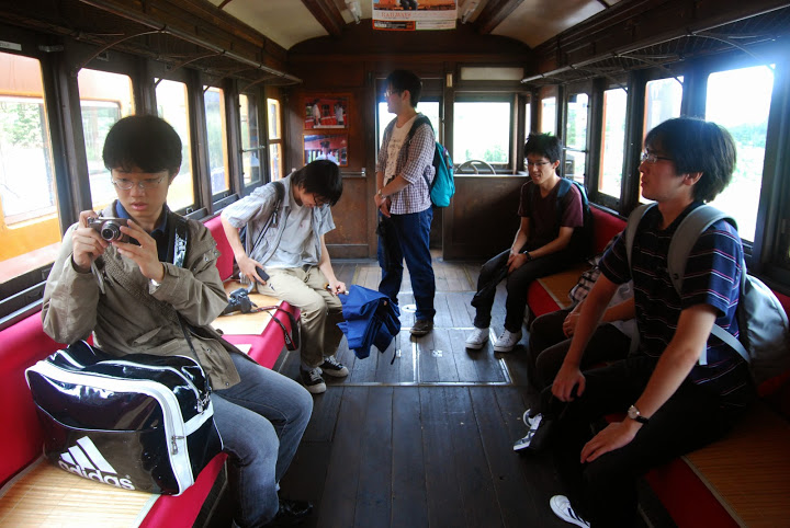 ▲レトロな車内で談笑する一行。
