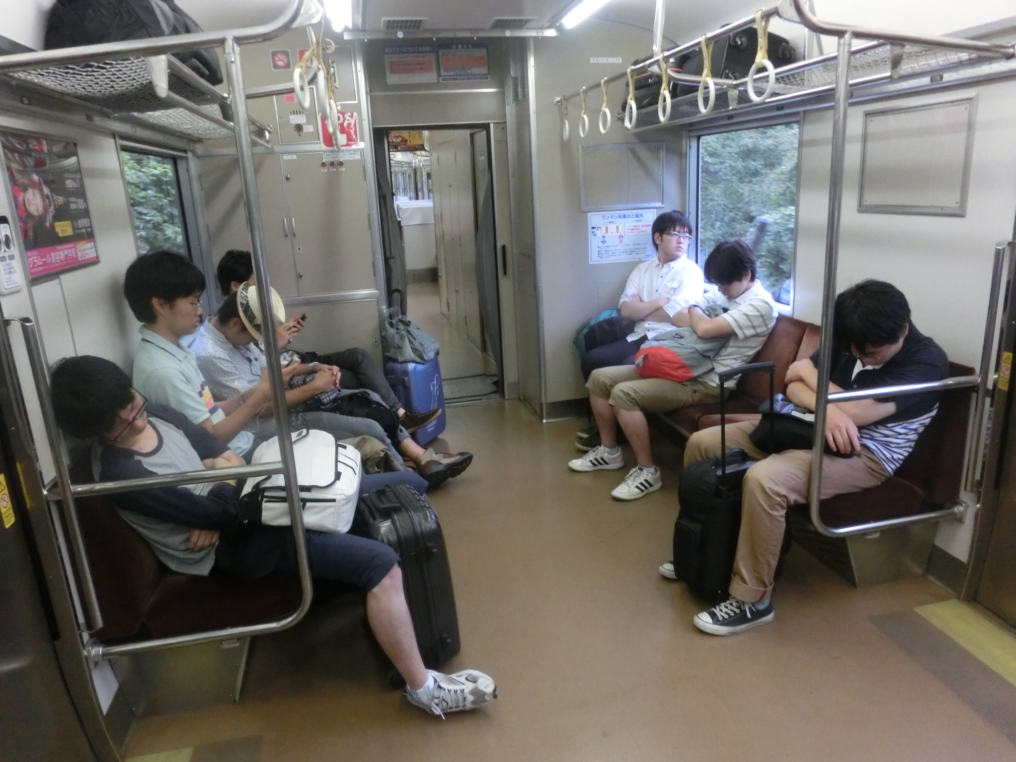 ▲その後もう一回列車を乗り継いで、伯備線で北上。朝から列車に乗り続けているため、ウトウトする会員もチラホラ…