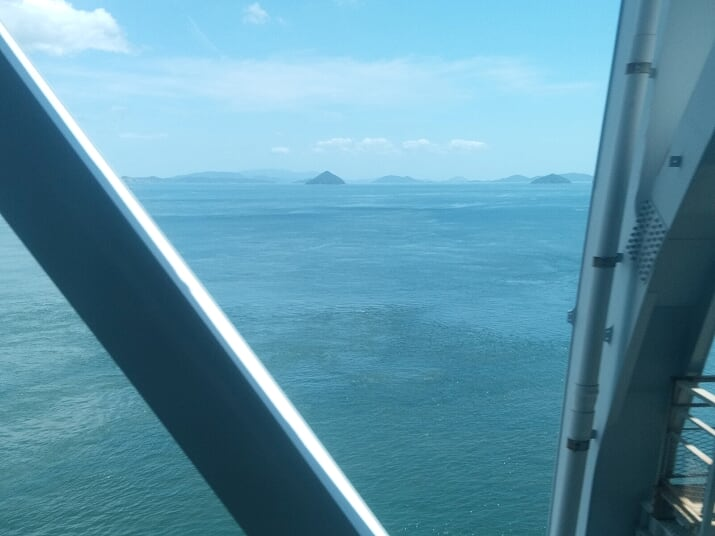 ▲埼玉を遠く離れて四国へ.一体どこに集合するのかと思ったらなんと「現地集合」.みんな集まれるのかと少し心配になりましたが,先行上陸していた会員を除いて無事岡山に集合しました.写真は瀬戸大橋を渡る電車の車内から.