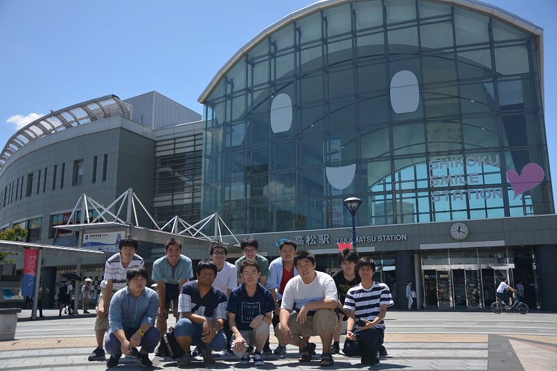 ▲1本後の快速マリンライナーに乗って高松駅に到着.集合写真を撮った後,駅近くのお食事どころで昼食をいただきました.